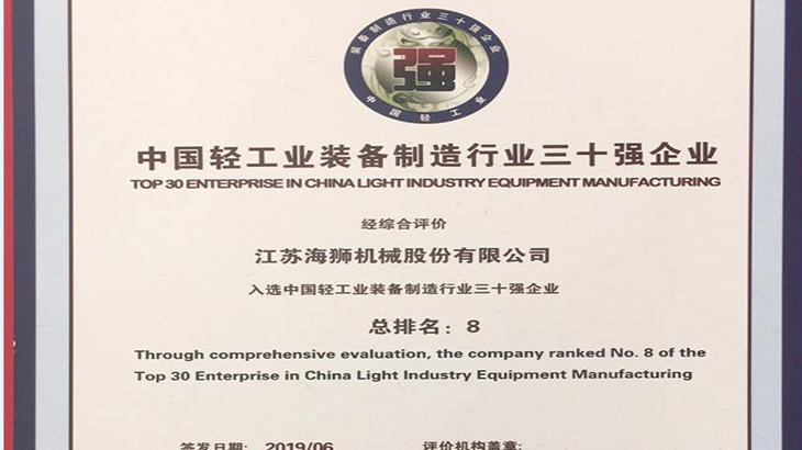 今日江蘇海獅機(jī)械股份有限公司榮獲了中國洗滌機(jī)械行業(yè)十強(qiáng)首位,中國輕工業(yè)裝備制造行業(yè)三十強(qiáng)企業(yè)第8位,中國輕工業(yè)科技百強(qiáng)企業(yè)第23位為加快建設(shè)強(qiáng)國,推動輕工裝備制造業(yè)做大做強(qiáng),本著嚴(yán)謹(jǐn)、公正、科學(xué)的原則,中國輕工業(yè)聯(lián)合會組織開展了2018年度“中國輕工業(yè)裝備制造行業(yè)三十強(qiáng)企業(yè)”、“中國輕工業(yè)科技百強(qiáng)企業(yè)”評價